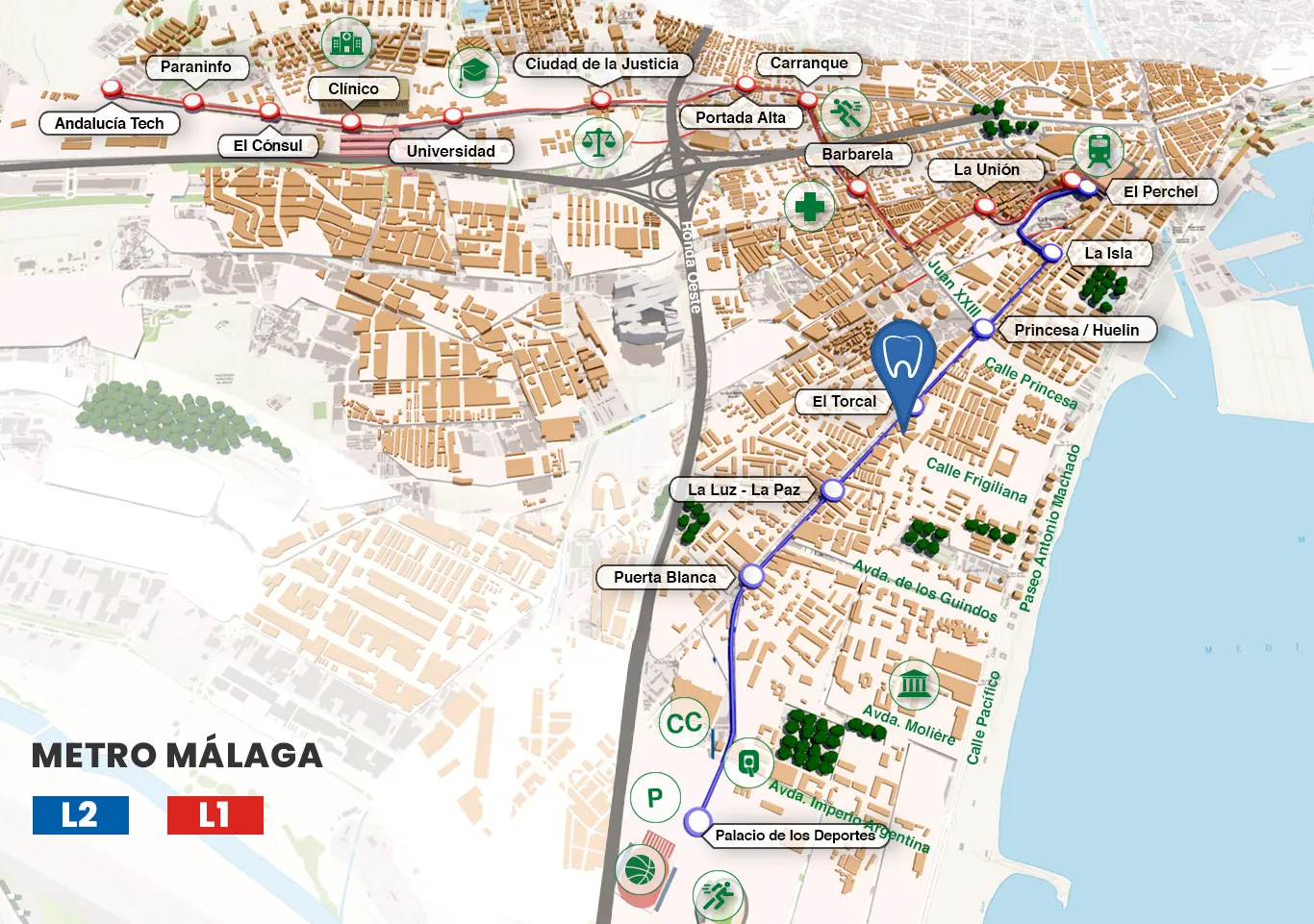 Es posible llegar a nuestra Clínica usando el metro, para ello se puede coger tanto la las líneas L1 y L2 y bajarnos en la parada del Torcal. Si vamos usamos la lineal L1 tendrás que hacer un salto de línea para poder llegar a El Torcal.